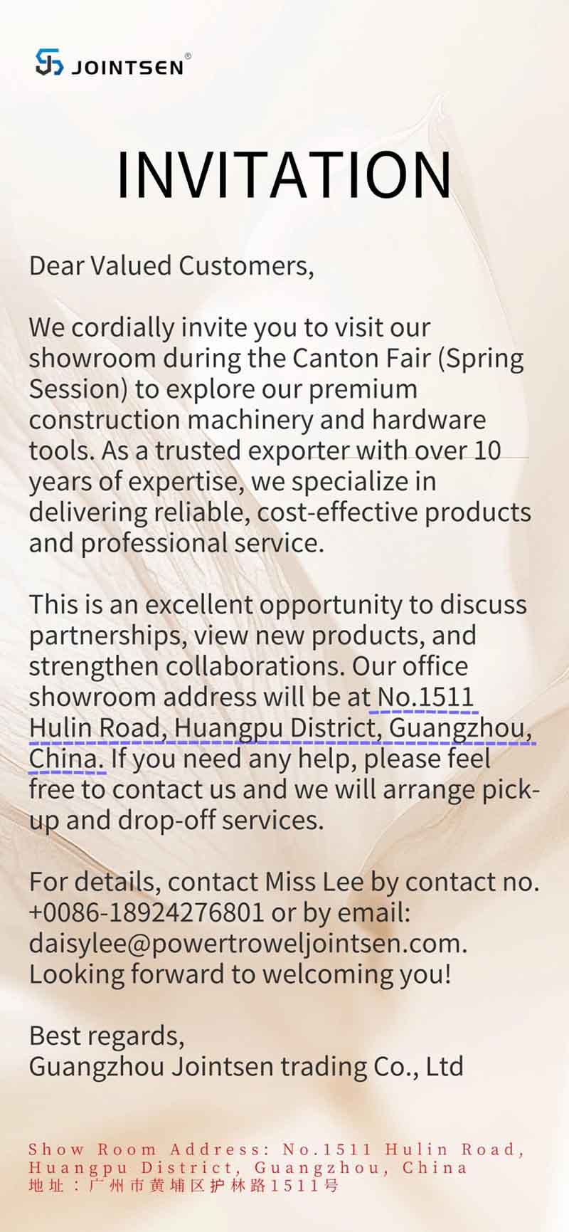 Sizi, premium inşaat makinelerimizi ve donanım araçlarımızı keşfetmek için Canton Fuarı (Bahar Oturumu) sırasında showroom'umuzu ziyaret etmeye davet ediyoruz. Ana ürünlerimizbeton titreşmişR,çelik çubuk makineleri, parlatma makinesi, yol kesme makinesi ve diğer yol makineleri. 10 yılı aşkın uzmanlığa sahip güvenilir bir ihracatçı olarak, güvenilir, uygun maliyetli ürünler ve profesyonel hizmet sunma konusunda uzmanlaşıyoruz.
